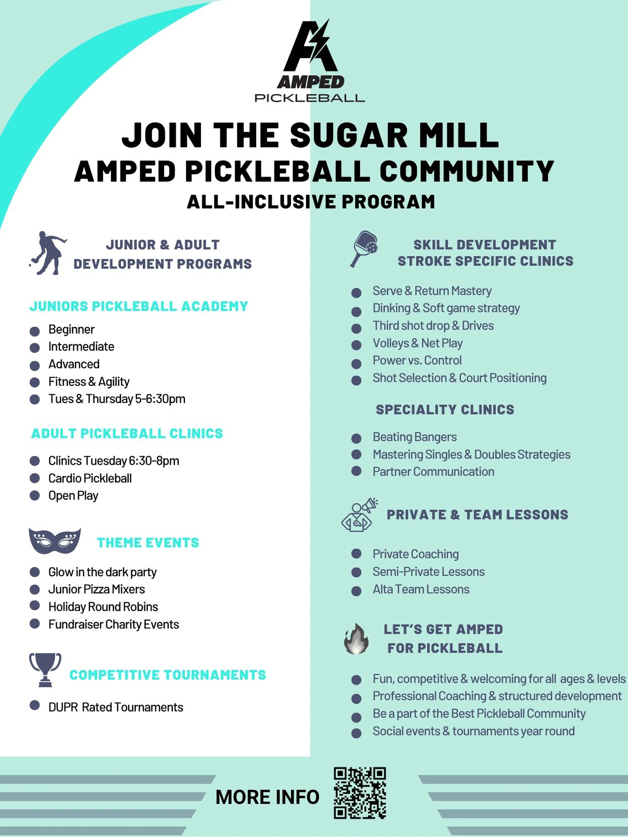 Amped Pickleball is an all-inclusive facility that offers weekly junior and adult clinics, special events, DUPR & UTR tournaments, and open play. Our experienced coaches provide consistent instruction to help our players improve their skills and have the best pickleball experience.